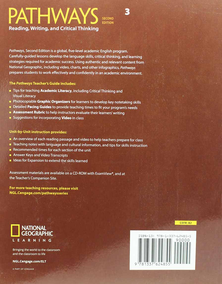 Pathways, Second Edition, is a global, five-level academic English program. Carefully-guided lessons develop the language skills, critical thinking, and learning strategies required for academic success. Using authentic and relevant content from National Geographic, including video, charts, and other infographics, Pathways prepares students to work effectively and confidently in an academic environment.