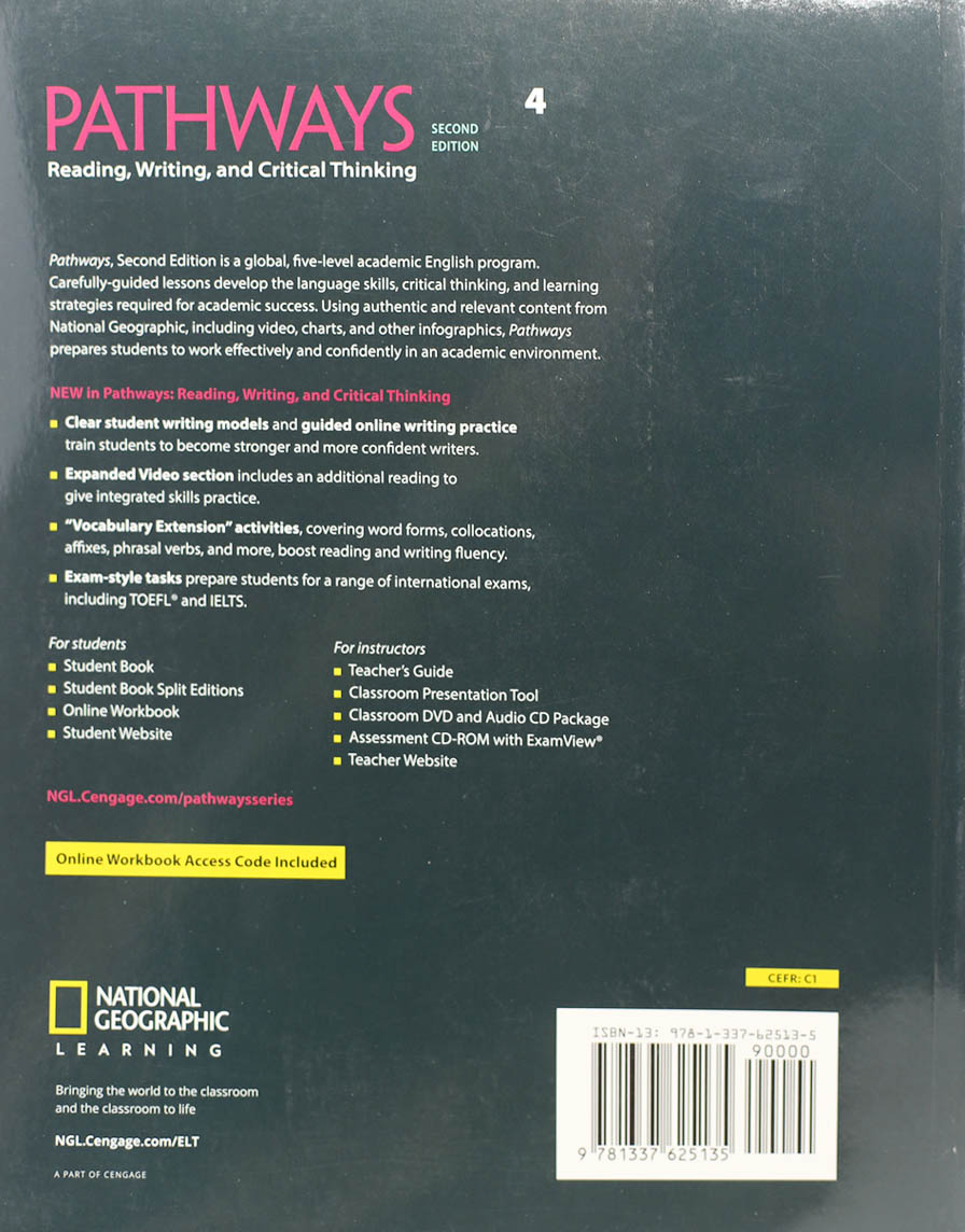 Pathways, Second Edition, is a global, five-level academic English program. Carefully-guided lessons develop the language skills, critical thinking, and learning strategies required for academic success. Using authentic and relevant content from National Geographic, including video, charts, and other infographics, Pathways prepares students to work effectively and confidently in an academic environment.