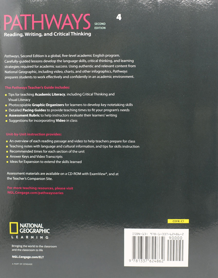 Pathways, Second Edition, is a global, five-level academic English program. Carefully-guided lessons develop the language skills, critical thinking, and learning strategies required for academic success. Using authentic and relevant content from National Geographic, including video, charts, and other infographics, Pathways prepares students to work effectively and confidently in an academic environment.