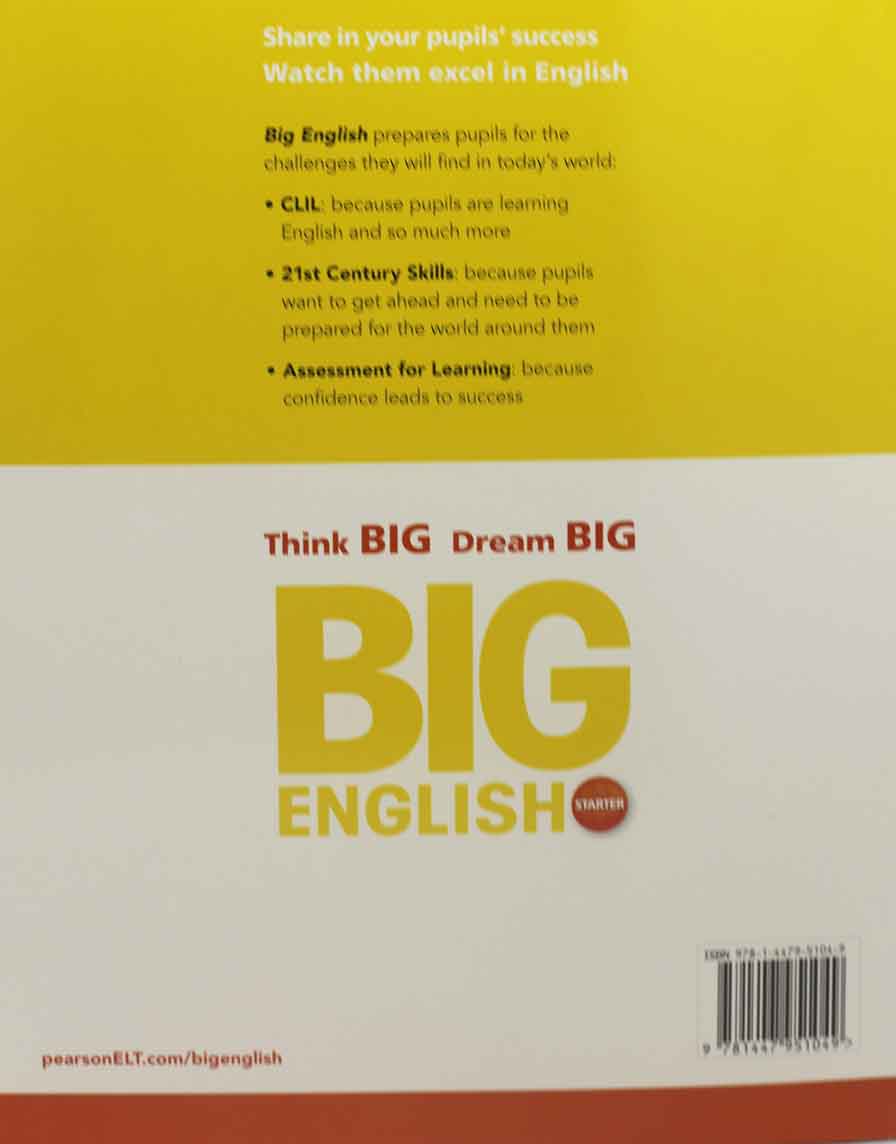 Share in your students' success. Watch them excel in English. BIG ENGLISH prepares students for the challenges they will find in today's world: CLIL: because students are learning English and so much more 21st Century Skills: because students want to get ahead and need to be prepared for the world around them Assessment for Learning: because confidence leads to success Think Big! Dream Big! BIG ENGLISH!