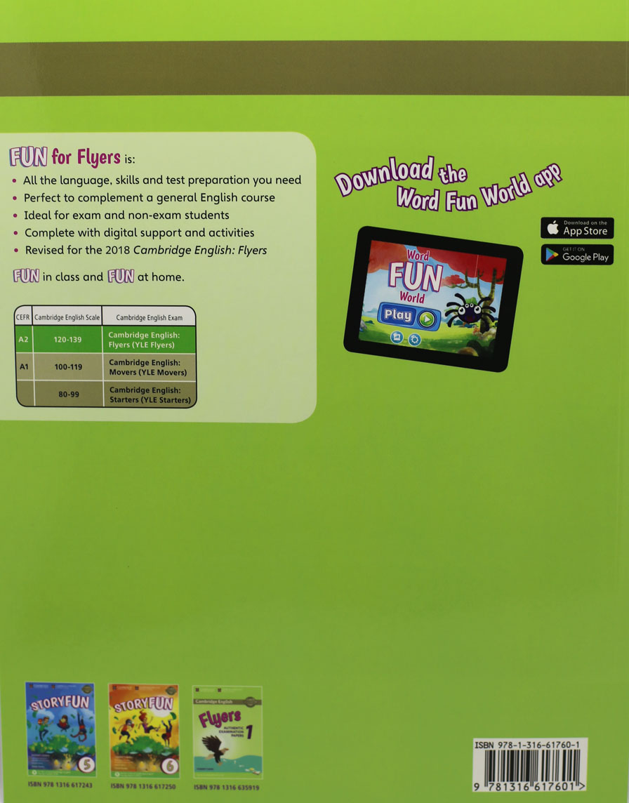 Fourth edition of the full-colour Cambridge English: Young Learners (YLE) preparation activities for all three levels of the test (Starters, Movers, Flyers) updated to reflect the new revised specifications which will be out in January 2018. Fun for Flyers Student's Book provides full-colour preparation for Cambridge English: Flyers. Fun activities balanced with exam-style questions practise all the areas of the syllabus in a communicative way and support young learners in the areas they find most difficult. Listening material to accompany the Student's Book is available online for download or as a separate Audio CD. Grammar and vocabulary activities get students practising online in their own time via an access code in the book. The Home Fun Booklet allows students to practice vocabulary at home.