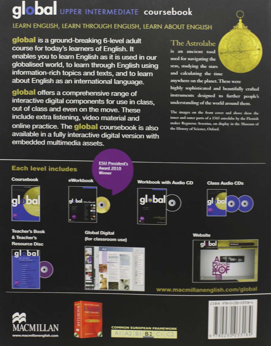 "Global" is a new six-level general English course for adult learners. It is an information-rich course, sophisticated in both presentation and approach. It has international appeal, combining challenging content, intelligent topics and cross-cultural awareness. It features none of the celebrity-driven lifestyle content often found in typical general English courses for adults. "The Global" approach is fully aware of the needs of today's learners, and places an emphasis on effective communication in English between both native and non-native speakers. "Global" helps users to learn English, to learn about English and to learn through English, and is the ideal course for students who want to communicate in a global environment.