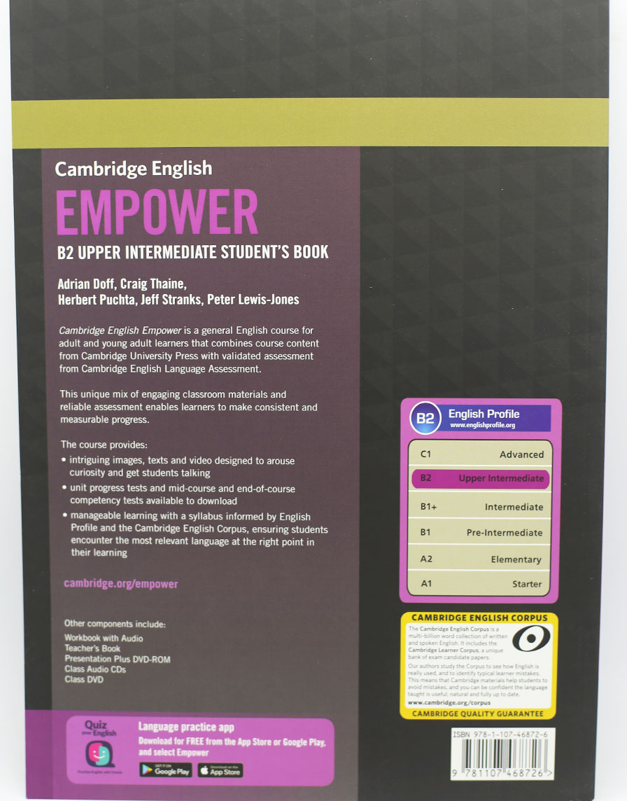 Cambridge English Empower is a general adult course that combines course content from Cambridge University Press with validated assessment from the experts at Cambridge English Language Assessment. The Upper Intermediate Student's Book gives learners an immediate sense of purpose and clear learning objectives. It provides core grammar and vocabulary input alongside a mix of skills. Speaking lessons offer a unique combination of functional language, pronunciation and conversation skills, alongside video filmed in the real world. Each unit ends with a consolidation of core language from the unit and focuses on writing within the context of a highly communicative mixed-skills lesson. This version of the Student's Book does not provide access to the video, assessment package and online workbook. A version with full online access is available separately.