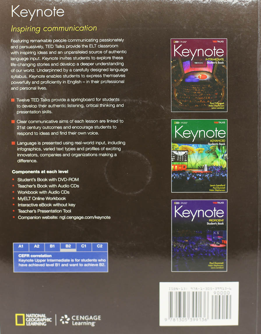 Through life-changing stories, respected thinkers and authentic presentations, Keynote promotes a deeper understanding of the world and gives students the courage and means to express themselves in English. Communication, collaboration and creative thinking drive students towards real 21st century outcomes and encourage them to respond to ideas and find their own voice. Both students and teachers will emerge with new confidence, new ideas and a new determination to communicate in this increasingly information-rich world of Global English.