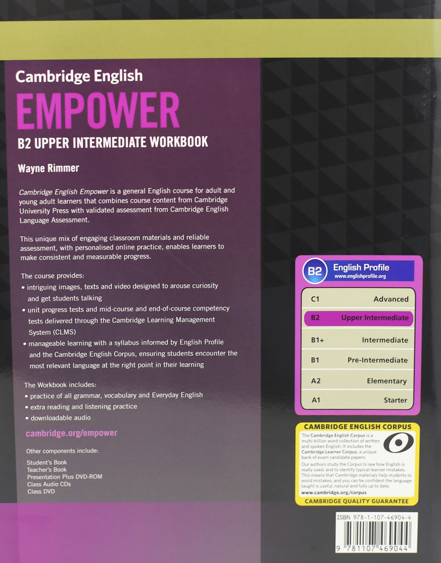Cambridge English Empower is a general adult course that combines course content from Cambridge University Press with validated assessment from the experts at Cambridge English Language Assessment. The Upper Intermediate Workbook with answers and downloadable audio can be used alongside the Student's Book and offers additional consolidation activities.