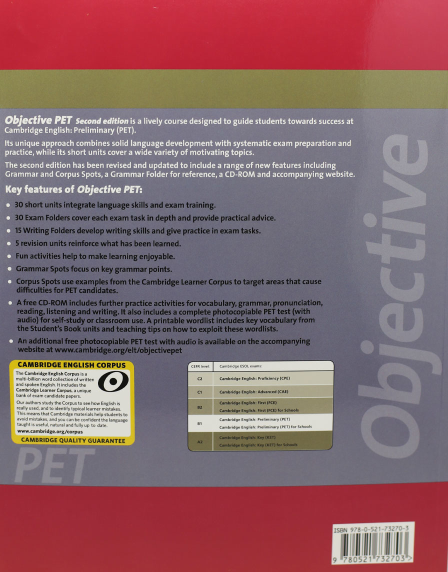 Objective PET Second edition is a completely updated and revised edition of the best-selling Objective PET course. This edition includes several great new features, including brand new 'Corpus spots' which alert students to common mistakes made by PET candidates. The Student's Book now includes a CD-ROM for extra language practice, including one complete printable PET practice test. The accompanying website includes an additional printable PET practice test. The Workbook provides further practice of language and vocabulary introduced in the Student's book. A Workbook 'with answers' is also available as are a Teacher's Book and a set of three Audio CDs.