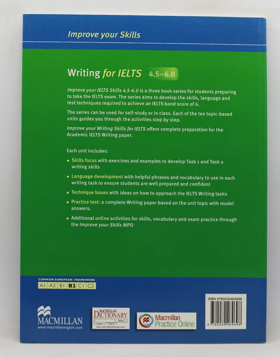 Improve your Skills: Writing for IELTS 4.5-6.0 Student's Book prepares pupils for the Academic IELTS Writing paper. The book is full of exercises and examples to help develop key Writing skills. Tips support students on how to approach the Writing tasks and MPO accompanies this book for further practice online. This is a `Without Key' version.